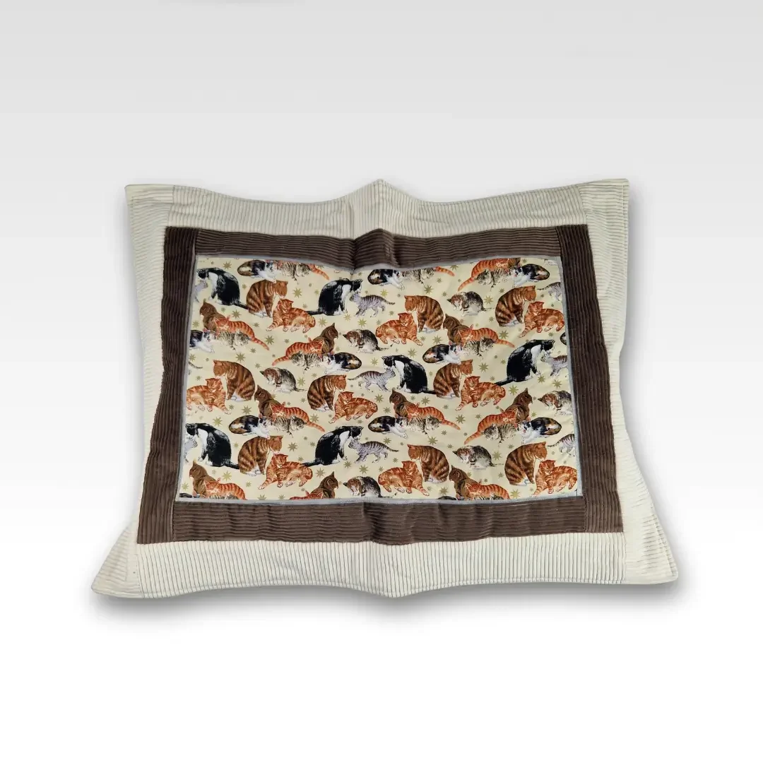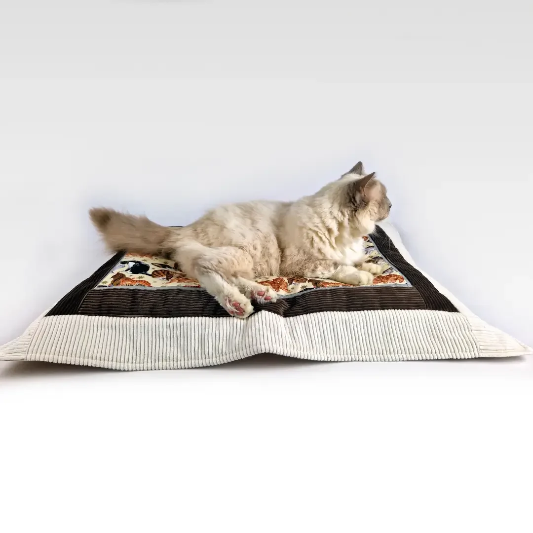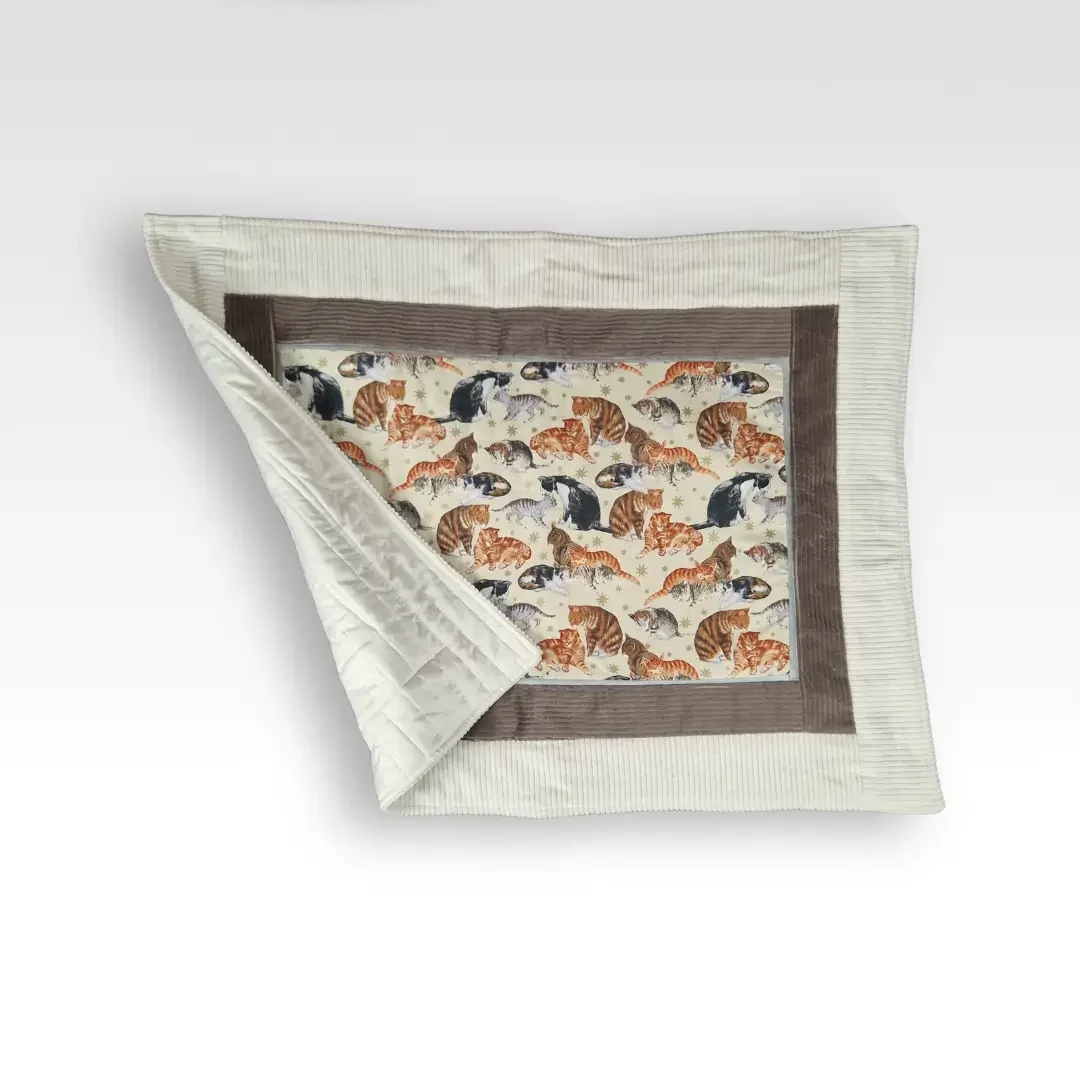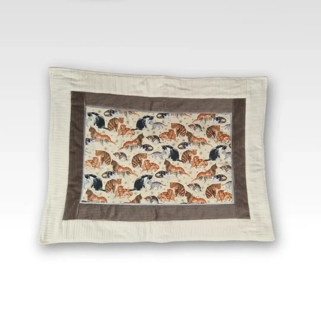 Zachte duo-tone ribcordbanen, een zilverkleurig PU-randje en een effen ecru satijnen achterkant maken ’m niet alleen cozy voor je kat, maar ook mooi genoeg om gewoon in je interieur te laten liggen. Perfect om de oude kattenmand of dat geliefde kussen te pimpen waar je kat geen afscheid van wil nemen.