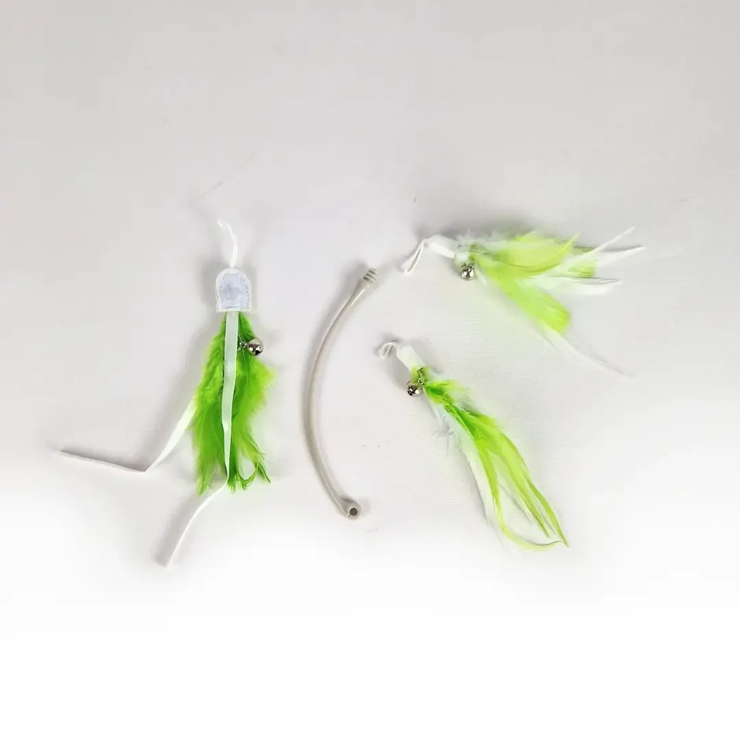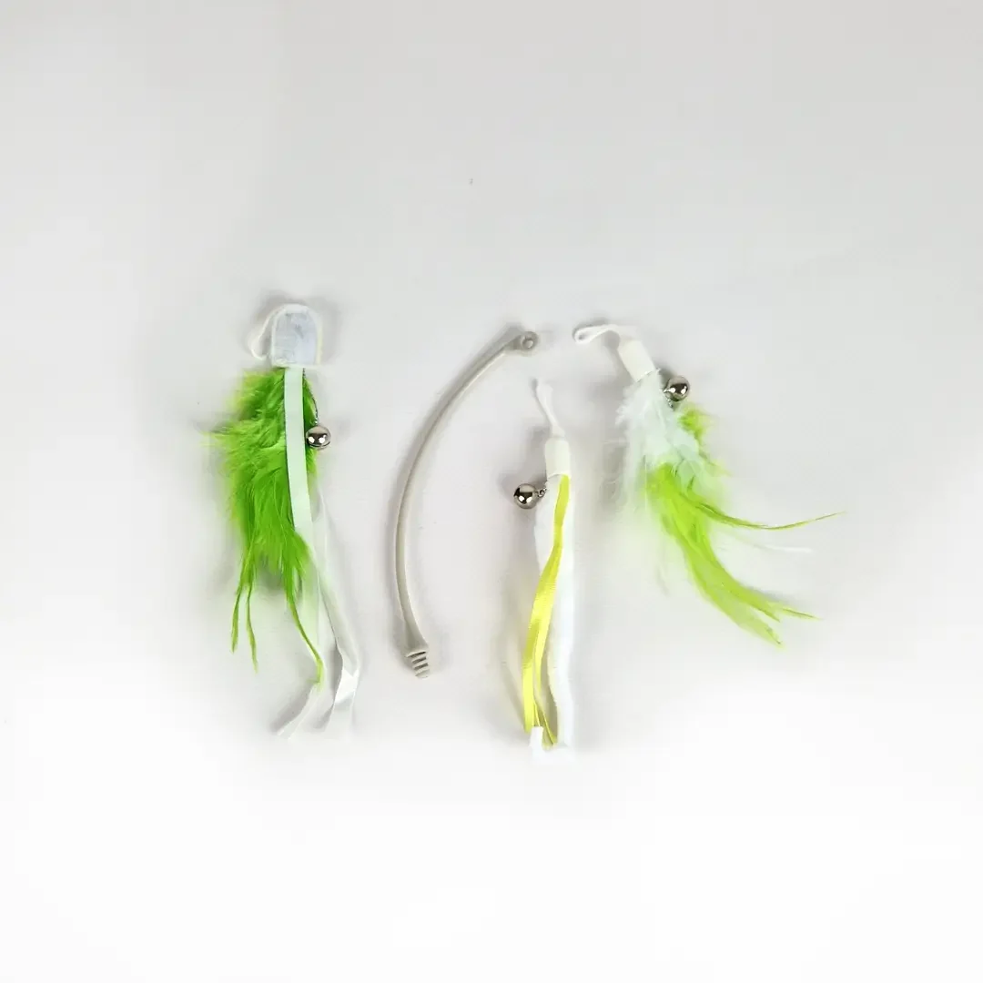 Bovenop klik je een stokje vast waar je verschillende opzetstukjes aan kan hangen: veertjes met lint, kleine pluimtoefjes of een vrolijk wurmpje met sliertjes. Ze hangen los aan het stokje, waardoor ze mee zwieren met elke beweging van het speeltje. Katten vinden dat heerlijk, want het lijkt alsof er steeds iets probeert te ontsnappen.