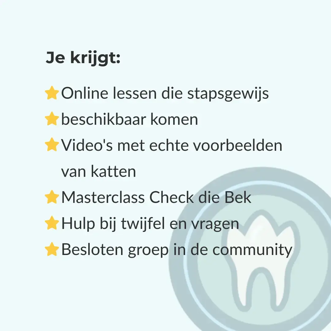 Een uitgekiend stappenplan met intensieve begeleiding, die alle ruimte geeft om te leren en met je kat mee te bewegen. Duidelijke voorbeeld video’s van katten die dat tandenpoetsen ook voor het eerst beleven. Niet gepolijst maar wel heel herkenbaar.